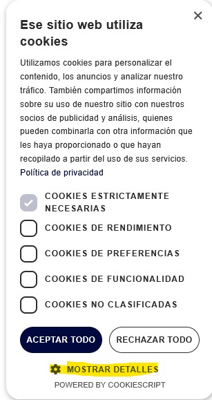 Las cookies utilizadas en este sitio web están disponibles para consulta y ajuste en el panel de configuración del banner de cookie en la esquina inferior izquierda de al web, al cual puede acceder y modificar sus preferencias en cualquier momento.