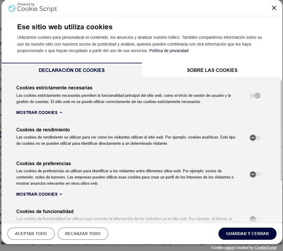 Al hacer clic en “Rechazar Todo”, únicamente se utilizarán las cookies estrictamente necesarias y no vendemos, ni venderemos, ningún dato personal que te identifique directamente a terceros. Sin embargo, podemos proporcionar a terceros, como nuestros socios de marca, información sobre nuestros clientes y sus compras. Antes de hacerlo, nos aseguraremos de que esta información no te identifique, ya sea agregándola, anonimizándola o eliminando identificadores personales de la misma.
